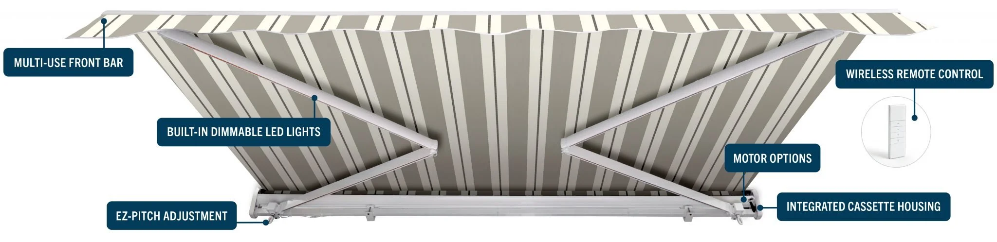 SunPro awnings are available in custom frame sizes. Customers will benefit from SunPro’s ability to produce tailor-made widths from 10 feet to 40 feet. Additionally, our awnings are available in three standard projection sizes: 8, 10 and 12 feet.